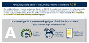 We developed the ACT at Home model and a host of other social distancing resources for students, teachers, and parents. They include information on how to build protective factors, support and safeguard youth, practice self-care, and ACT in an environment where we can’t be around others who may be struggling. We continued to focus on a framework of safety, predictability, and control (I emailed in March about that) and made all new materials publicly available to any school who needed them.